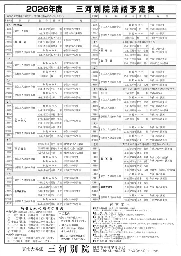 2026年2月7日 2026年度 法話予定表