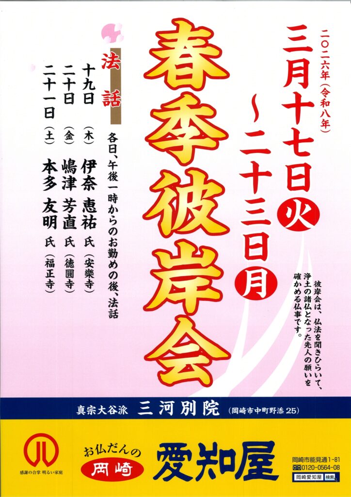2026年3月11日 春季彼岸会法要(3月17日~3月23日)のお知らせ