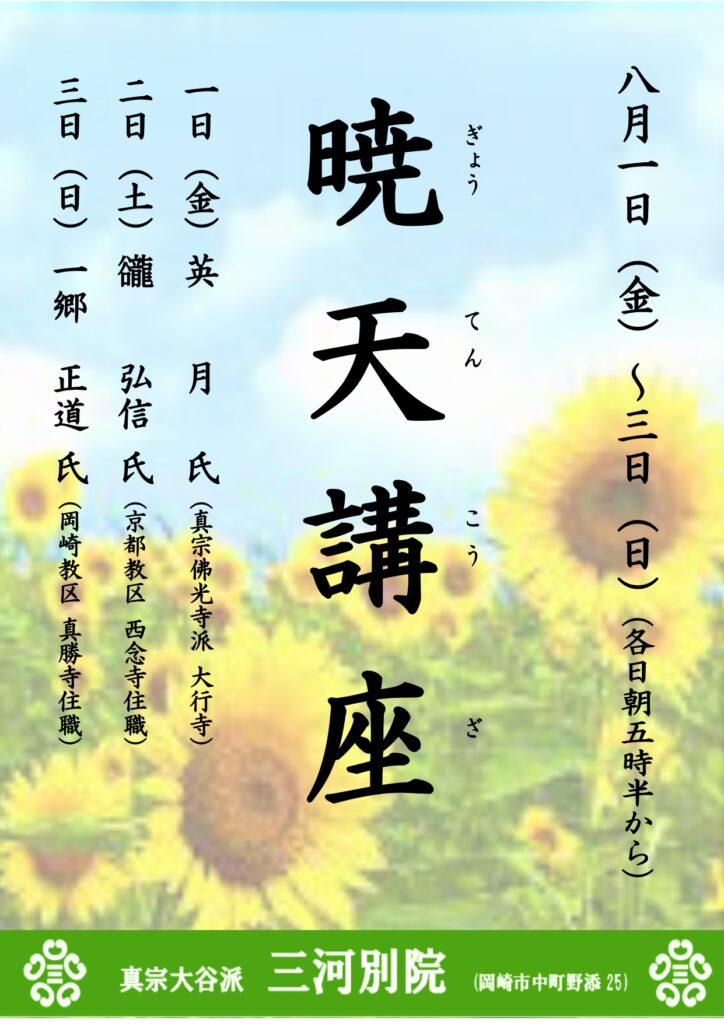 「暁天講座」(ぎょうてんこうざ)は、お寺で夏の暑い日ざしを避け早朝の涼しい時間帯に仏教の教えを聞く講座です。澄み切った空気の中で一日の始まりをお寺から始めてみませんか?どなた様でもお気軽にお越しください。日時 令和7年8月1日(金)~3日(日) 5時半から■8月1日(金) 講師 英 月 氏 (佛光寺派 大行寺)■8月2日(土) 講師 豅 弘信 氏 (米子市 西念寺住職)■8月3日(日) 講師 一郷 正道 氏 (静岡市 真勝寺住職)